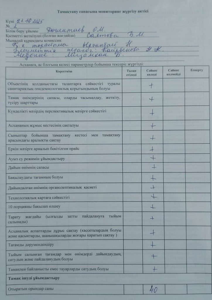 Тамақтану сапасына мониторинг жүргізу актісі. Қазан айы