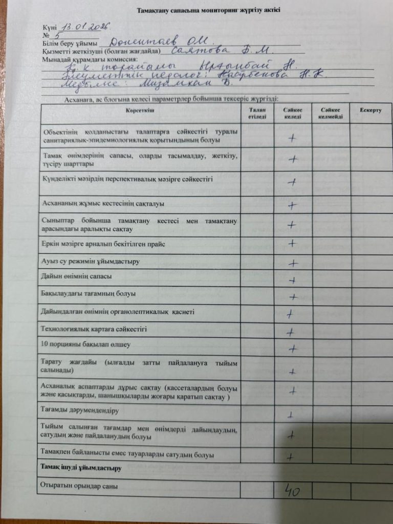 Тамақтану сапасын мониторинг жүргізу актісі. Қаңтар айы